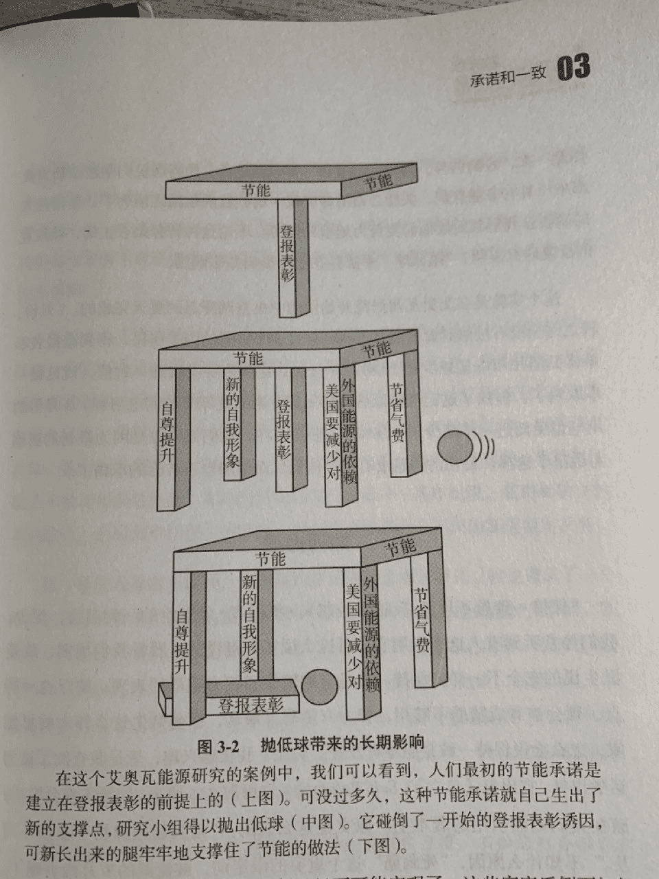 这里的承诺,包括:一句不经意的话(xx的行为是正确的)、一些虚无缥缈的头衔(比如:环境保护形象大使)。还有一些能让承诺加强的行为,比如:承诺用白纸黑字写下来、承诺是在许多人的见证下的、承诺是经过非常大的努力的(比如:美国大学一些社团的地狱周)。