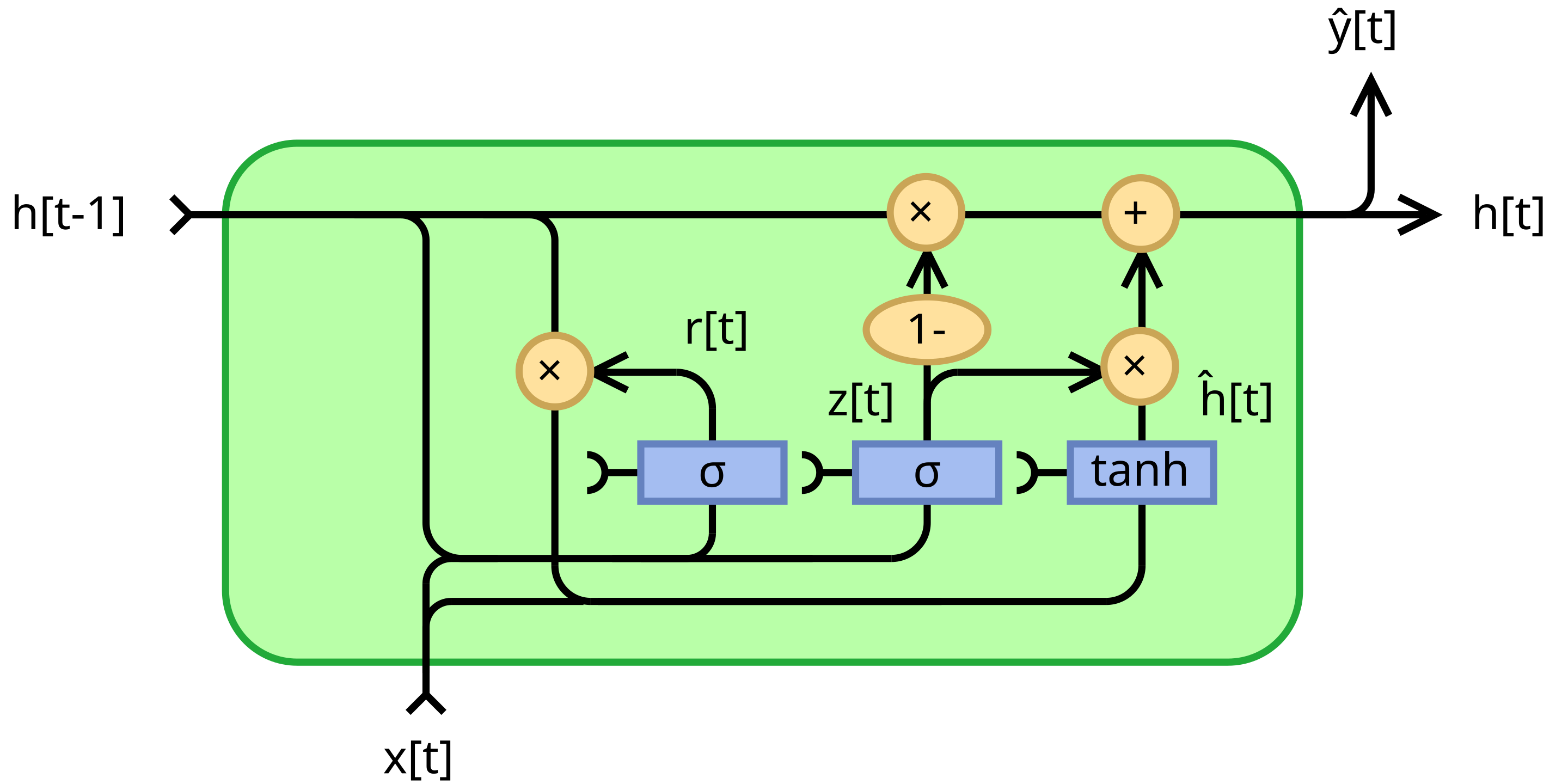 \[\begin{aligned} z_t &= \sigma\left( W_z x_t + U_z h_{t-1} + b_z \right) & \text{(update gate)} \\ r_t &= \sigma\left( W_r x_t + U_r h_{t-1} + b_r \right) & \text{(reset gate)} \\ \tilde{h}_t &= \tanh\left( W_h x_t + U_h (r_t \odot h_{t-1}) + b_h \right) & \text{(candidate hidden state)} \\ h_t &= (1 - z_t) \odot h_{t-1} + z_t \odot \tilde{h}_t & \text{(final hidden state)} \end{aligned}\]符号 | 含义 |